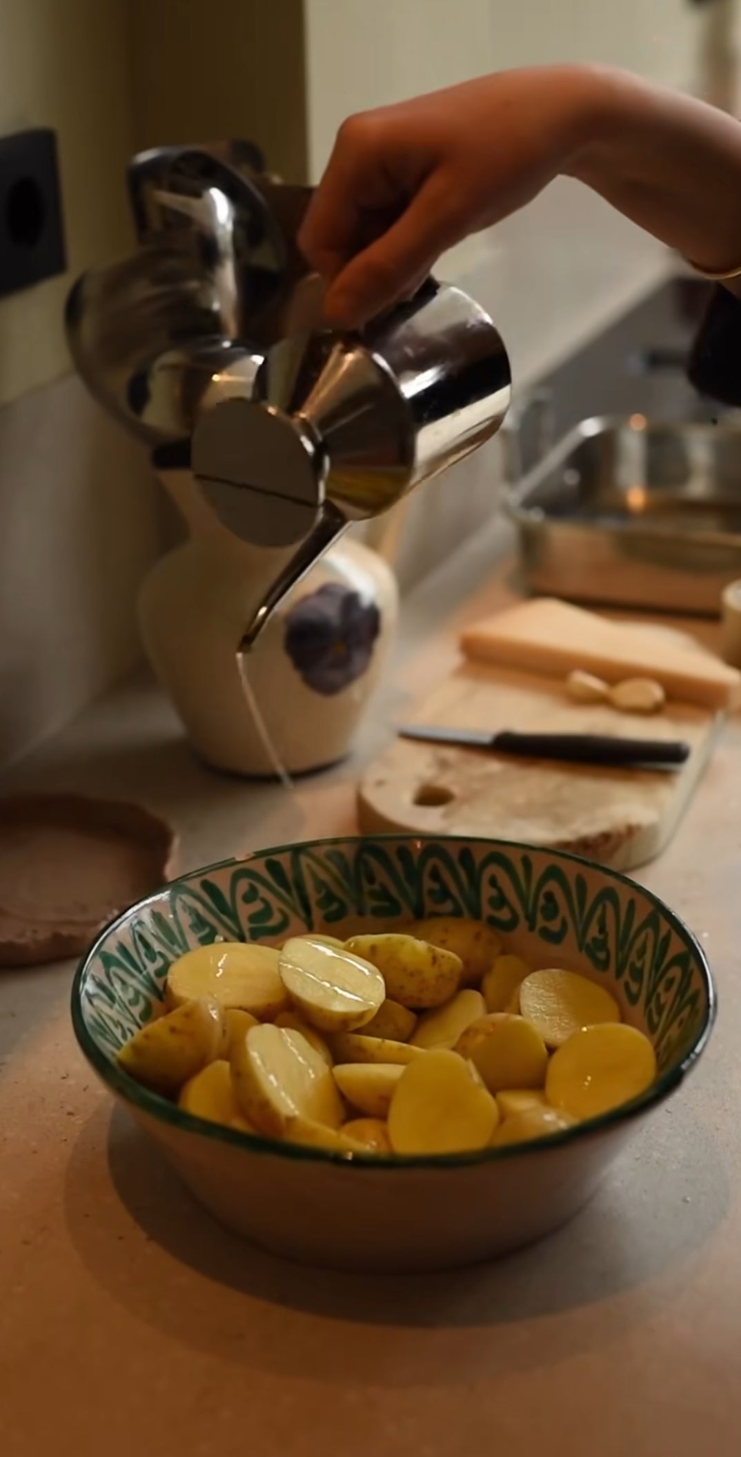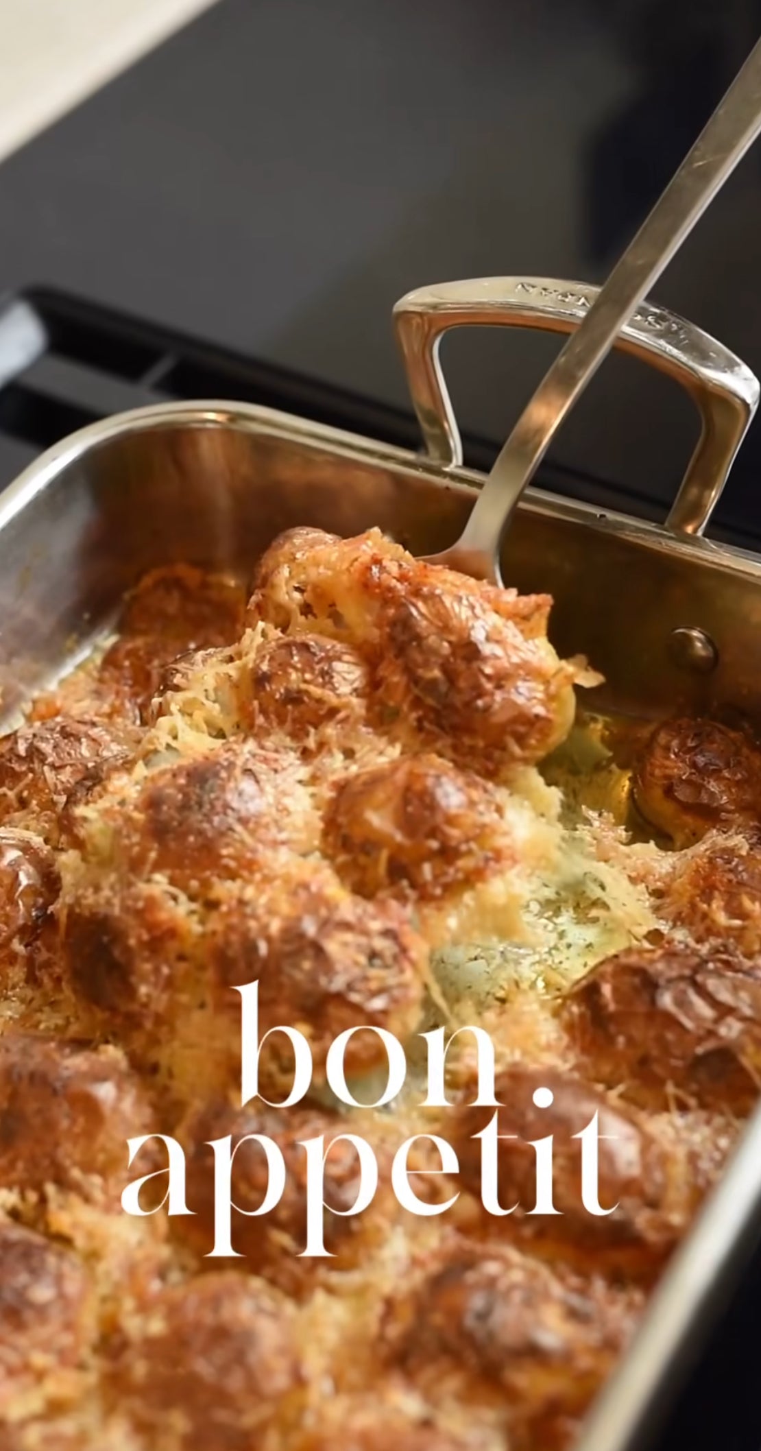 Halfed potatoes, scored with tiny grids, get a massage of olive oil, garlic, and thyme. Then they dive into a baking dish of melted butter and mountains of Parmesan, sitting cut-side up like little golden soldiers.